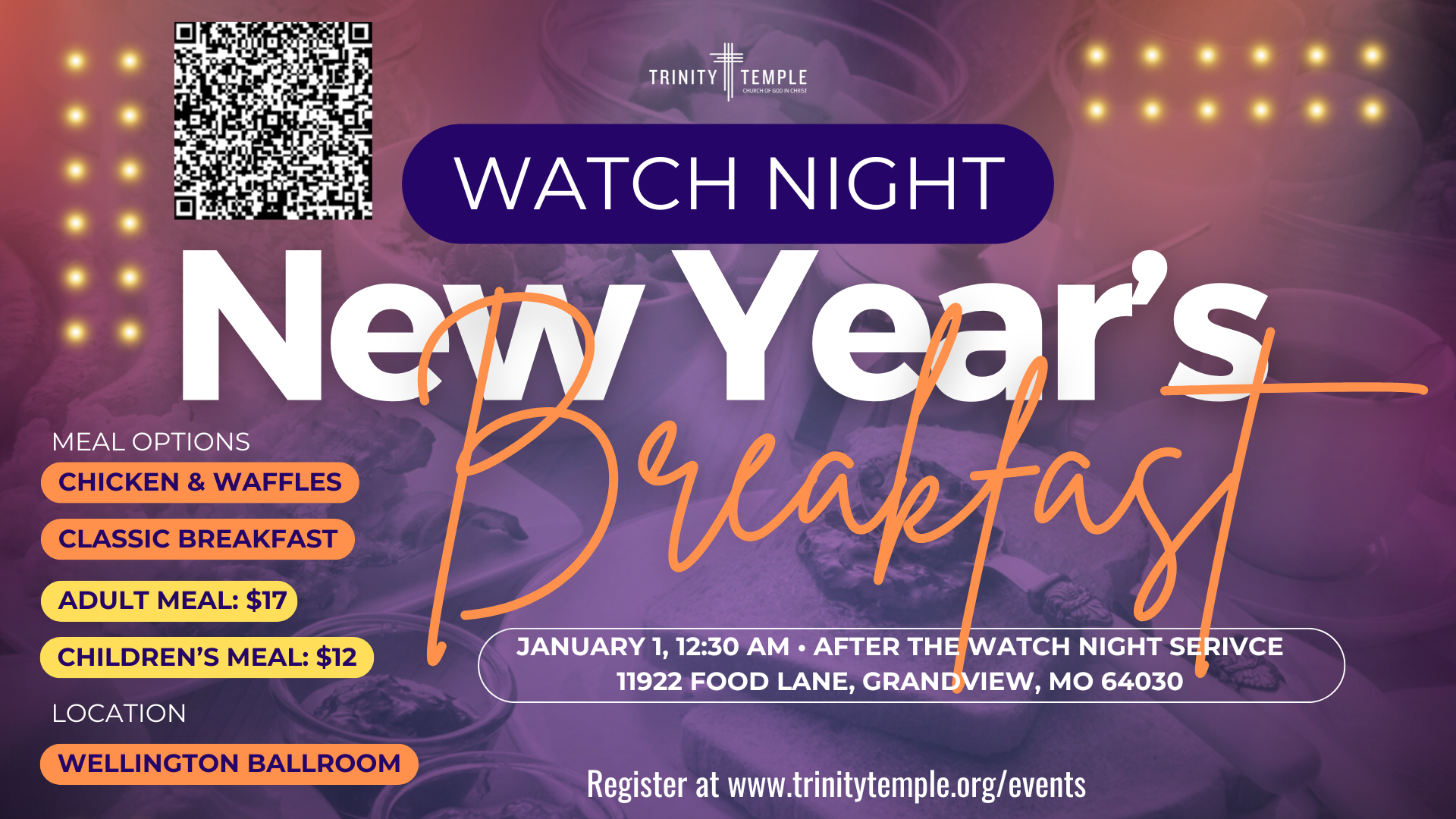 Join us for a delicious New Year’s Breakfast after our watch night service. Adults $17 and Youth 11 years and younger $12.